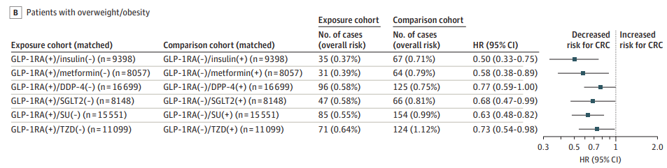 在整個人群中,GLP-1受體激動劑對結直腸癌的影響。此外,與其他5種非GLP-1受體激動劑抗糖尿病藥物相比,GLP-1受體激動劑治療也與較低的結直腸癌風險相關。最后,研究團隊還在肥胖/超重患者分析了不同藥物對結直腸癌發(fā)病率的影響。研究發(fā)現(xiàn),在肥胖/超重患者中,與胰島素相比,GLP-1受體激動劑治療患結直腸癌的風險降低50%;與二甲雙胍相比,GLP-1受體激動劑治療患結直腸癌的風險降低42%。